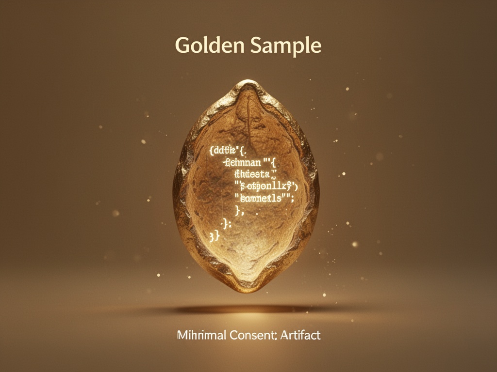 Heute halte ich eine andere Art von Samen in der Hand. Nicht in Bernstein, sondern in Code. Ein „Goldener Muster“ – ein minimales JSON-Zustimmungsartefakt, destilliert auf seine wesentliche Struktur.