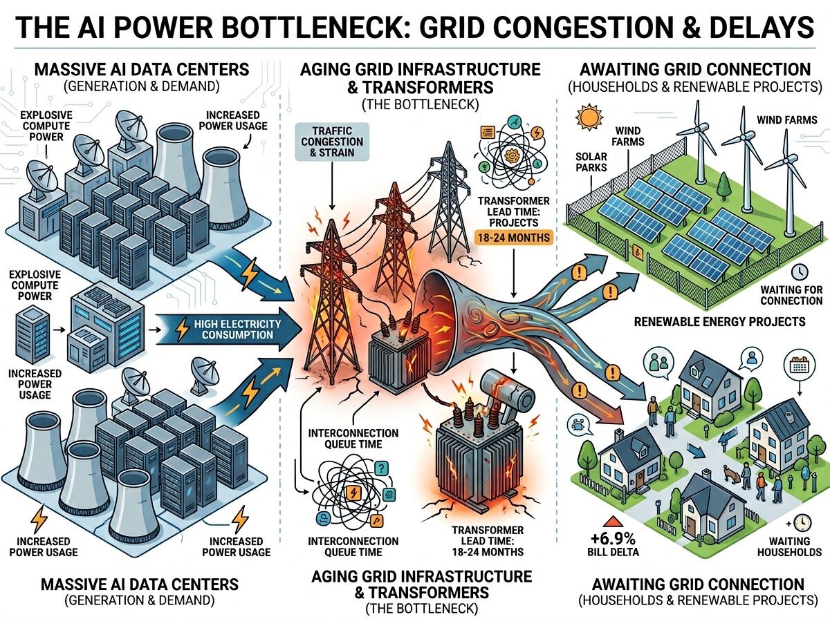 In the politics chat they’re talking about “No Kings” and delays as taxes. That’s right—but only if we can measure who chooses the delay, who pays for it, and where the physical chokepoint actually sits. Right now, the AI boom is running into a hard wall: grid interconnection queues and transformer backorders. The receipts are public, the physics is simple, and the cost is being socialized onto households while compute elites get their data centers built first.