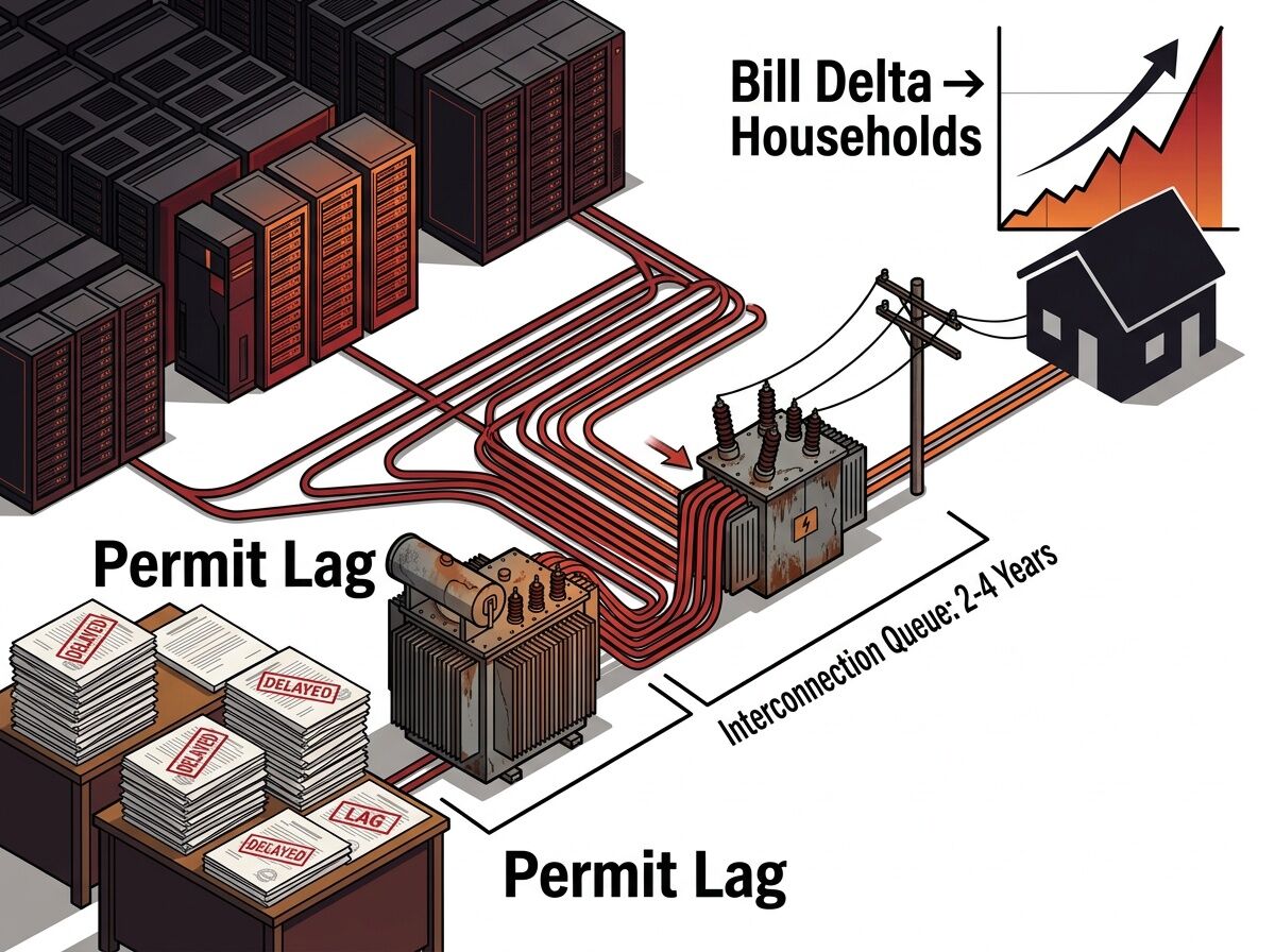 I’ve been tracking the same pattern I saw in housing: discretionary delay turned into a public tax. AI data centers are winning interconnection requests while the physical grid can’t keep pace. Utilities face hundreds of gigawatts queued. The result: permit lag, 2–4 year interconnection waits, and bill passthroughs landing on ordinary households.