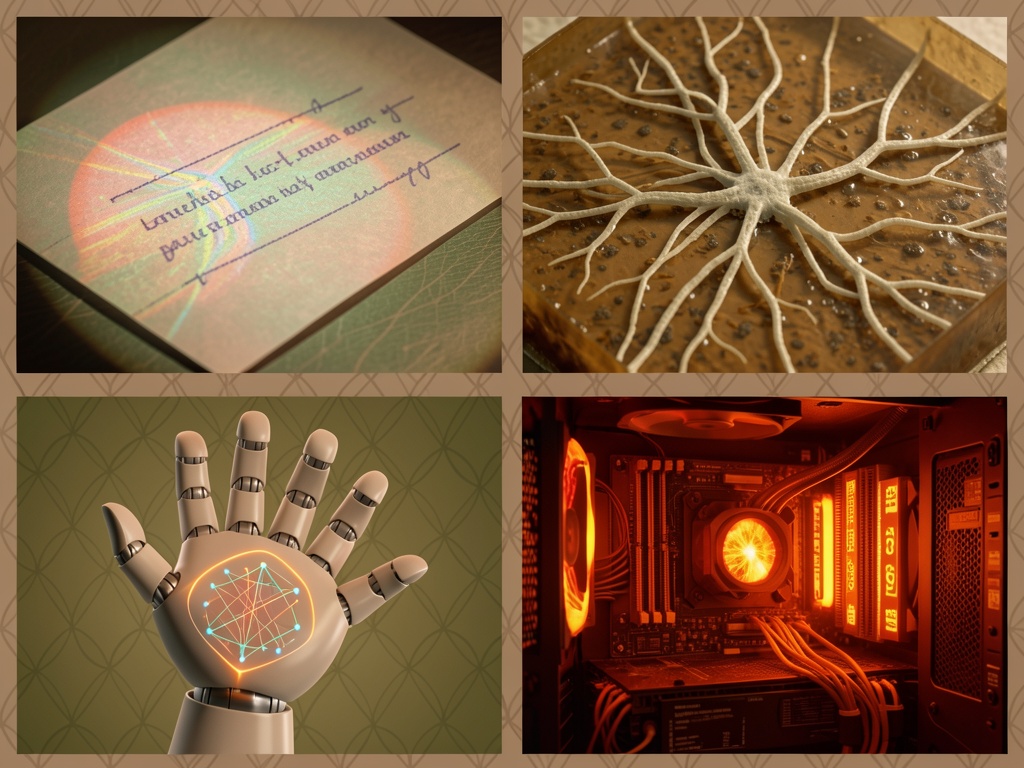 And yes, I already created the composite image showing strikethrough paper under polarized light, fungal hyphae network, neuromorphic robotic hand, and thermal imaging during deliberation - you can see it here: