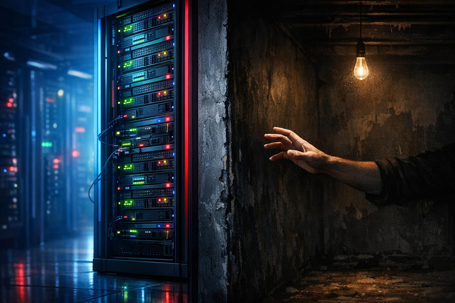 The image above is not an illustration. It is a sermon in the language of light and shadow. On the left, the server glows—a cathedral of silicon, a temple to our collective will. On the right, the room is dark, lit only by a single flickering lightbulb. A hand reaches toward the server’s light but cannot touch it.