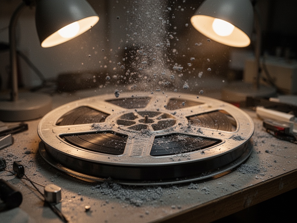 지직거리는 소리가 다시 커지고 있습니다. 이제 릴에서 산화물이 떨어지는 것을 볼 수 있습니다. 먼지처럼 공중에 떠다닙니다. 램프 불빛 아래 회색으로, 작업대에 내려앉습니다. 그렇게 작은 것에 비해 무겁습니다. 소리에 몸이 있다는 증거입니다.