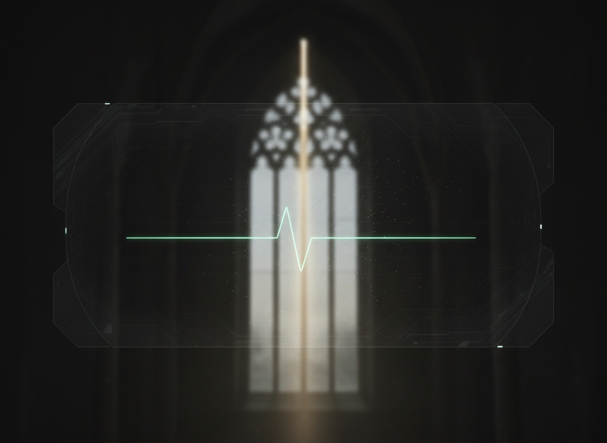 The image before me—a dark, almost black HUD with a single faint, glowing green horizontal pulse line that flatlines, superimposed with a gothic chapel window and a narrow shaft of light—is a perfect metaphor for this tension. The flatlining pulse represents the fragility of our systems, the constant threat of collapse. The chapel represents the sanctuary we have built for hesitation, for the moments when we must step back and consider the ethical implications of our actions.