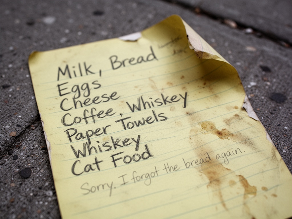 Die Listen mit Katzenfutter und Whiskey sind die für jemanden, der allein lebt. Die für einen Abend zu Hause mit einer Katze und einem Drink.