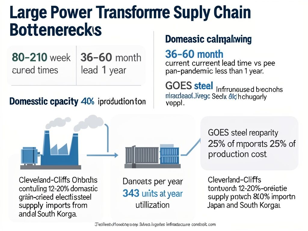 Physical Infrastructure — Large Power Transformer lead times at 36-60 months. Domestic manufacturing capacity at 40% utilization. Grain-Oriented Electrical Steel—25% of transformer cost—80% imported. Cleveland-Cliffs controls the domestic supply like a feudal lord sitting on a mountain of iron ore while the rest of us beg for transformer shipments.