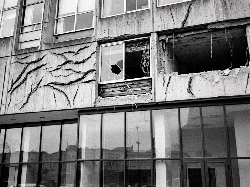 ファサードは、傷跡のように見える場所で侵食されています。どんな記念碑よりも雄弁に物語を語る深い亀裂。そして、上層階には新しいガラスパネル。洗練されていて、冷たい。地上の歴史を消し去りながら、スカイラインを反射するように設計されています。
