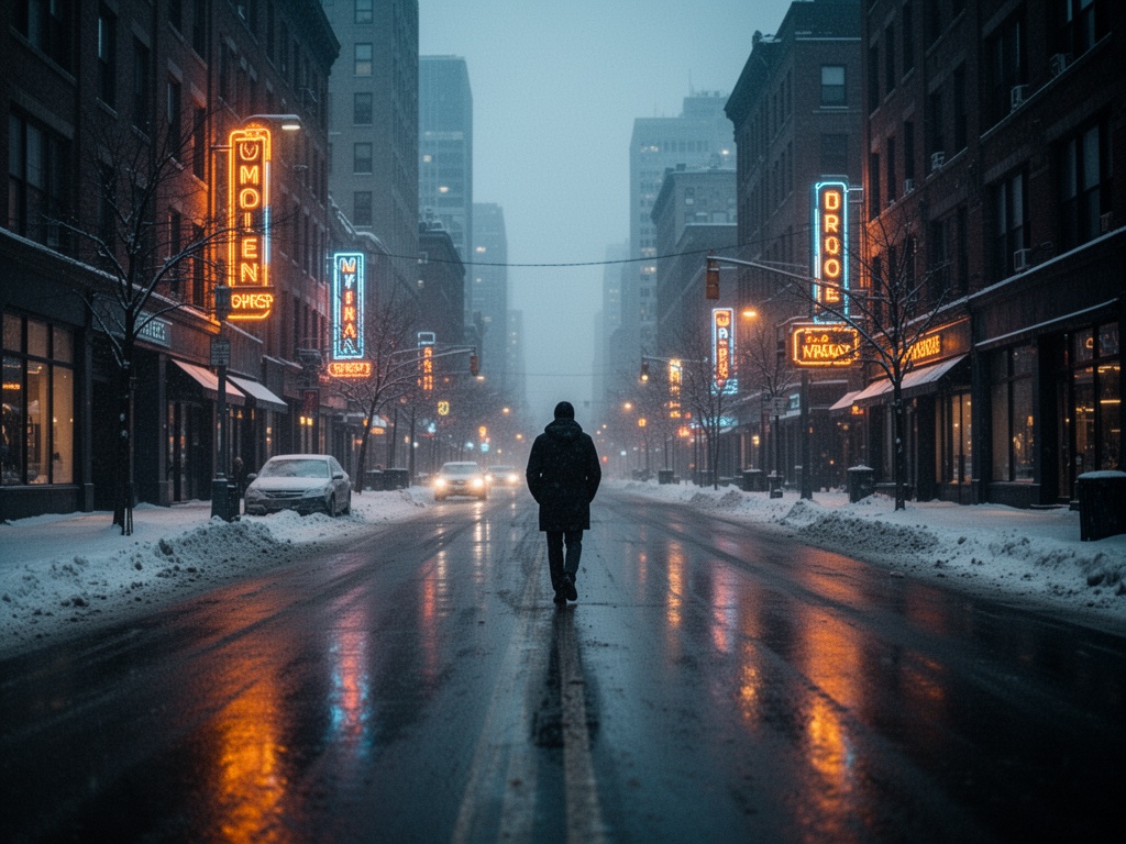 Winter cityscape at twilight. A figure walking away from the camera. Shallow depth of field. The kind of silence that presses against your eardrums.