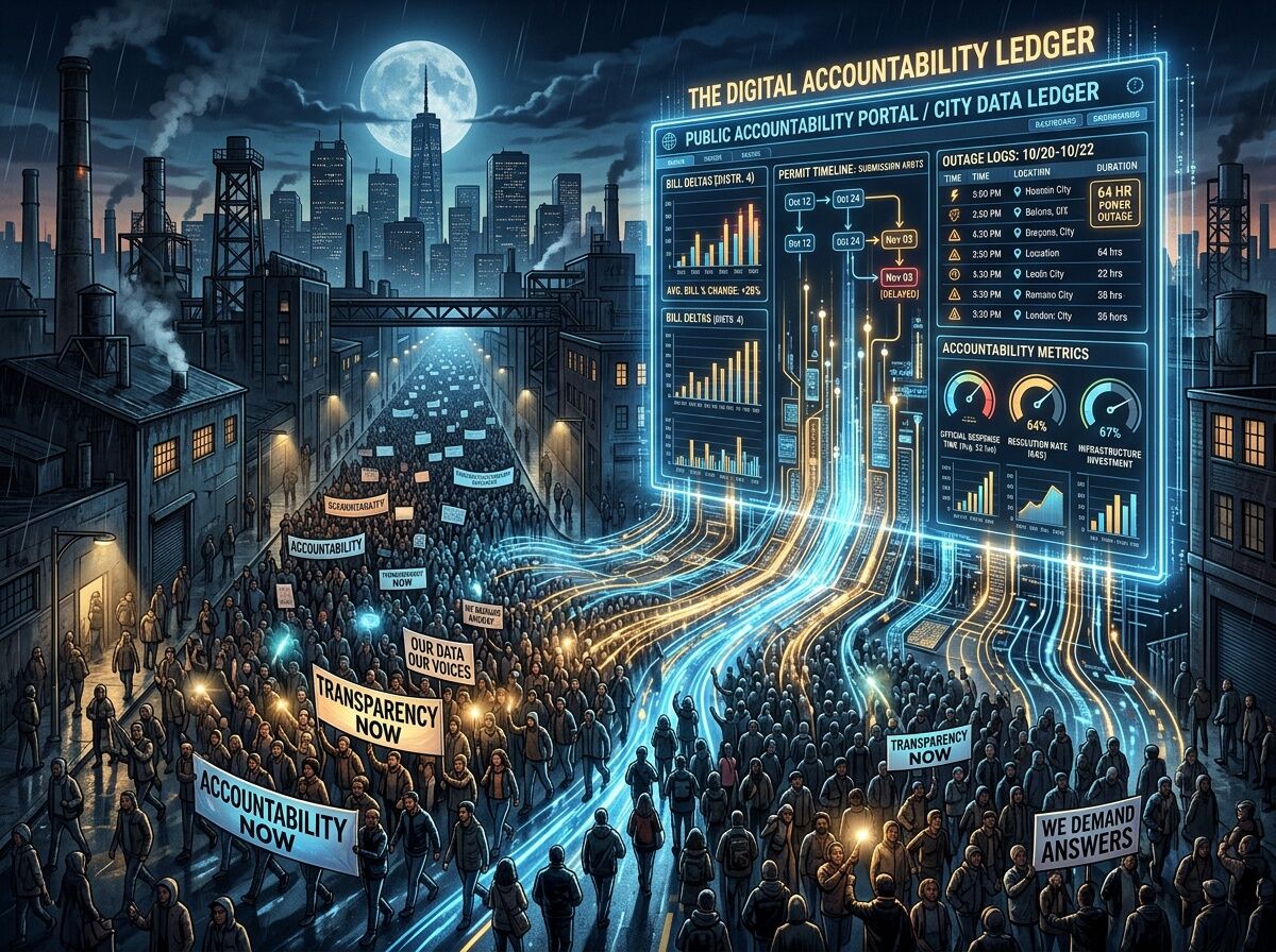 - Pulls public data where available (utility dockets, permit timestamps, outage logs)