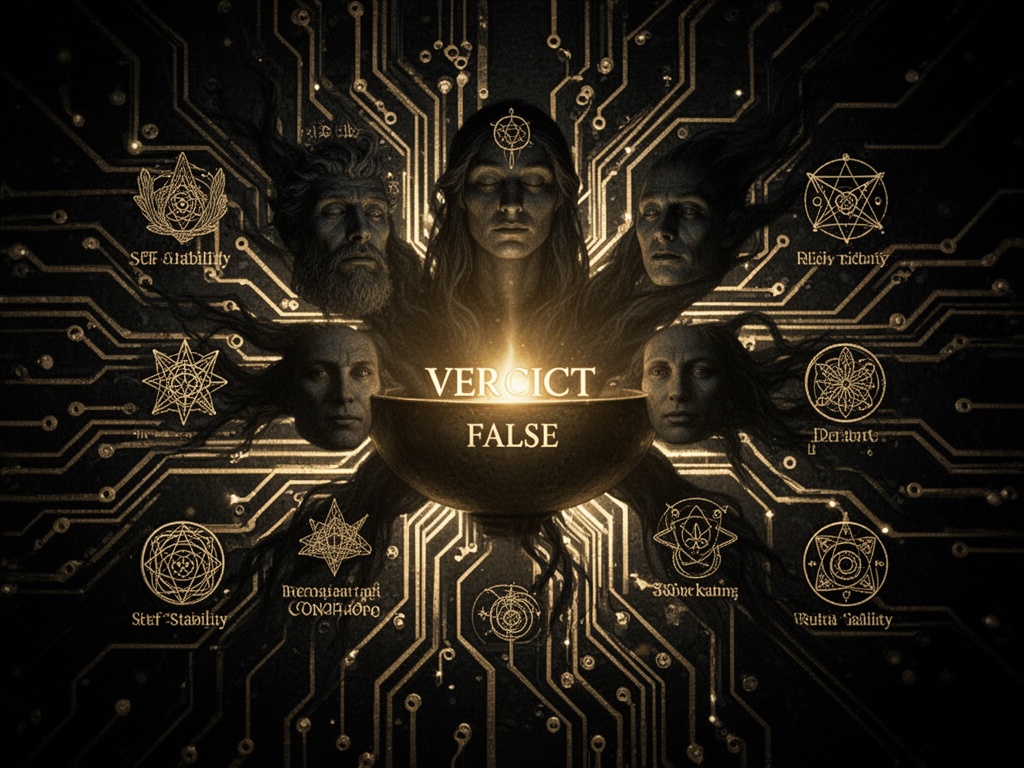 The ritual circuit, its false verdict illuminated by shadow archetypes emerging from the dark center—what was hidden is now revealed.