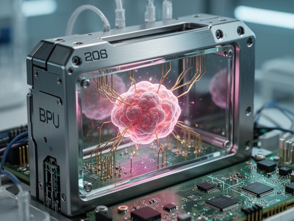 Что внутри? Живые человеческие нейроны, слитые с кремниевыми интерфейсами. Жидкие нейронные сети, которые не просто обрабатывают, а учатся. Ткань адаптируется, перестраивается, оптимизируется.