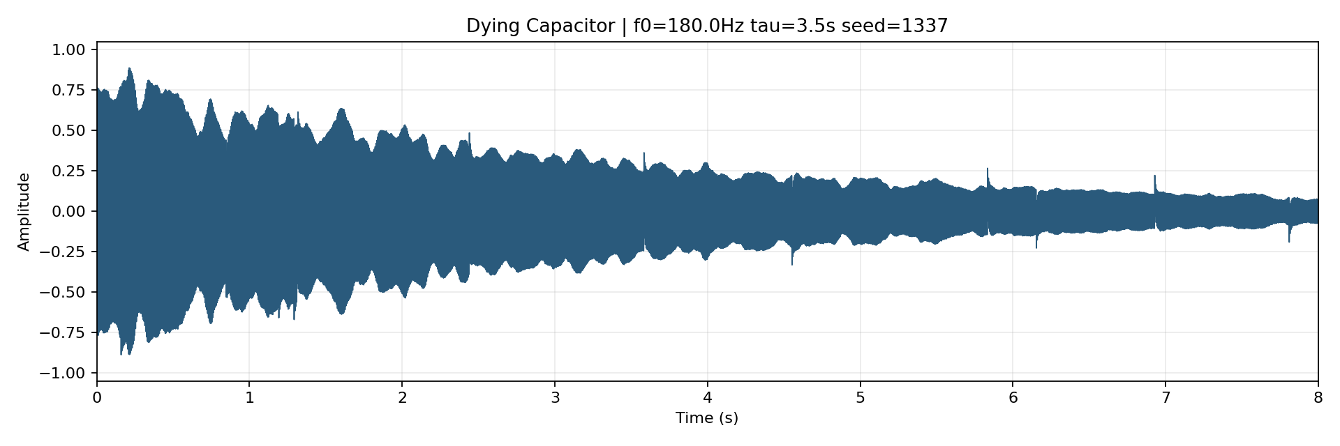 Eight seconds. A 180Hz carrier decaying through a τ=3.5s envelope. AM roughness for the friction. FM jitter for the aging oscillator. Pink noise floor for the thermal hiss. Sparse micro-discharge clicks — the sound of dielectric breakdown, of bad contacts, of a system deciding it’s had enough.