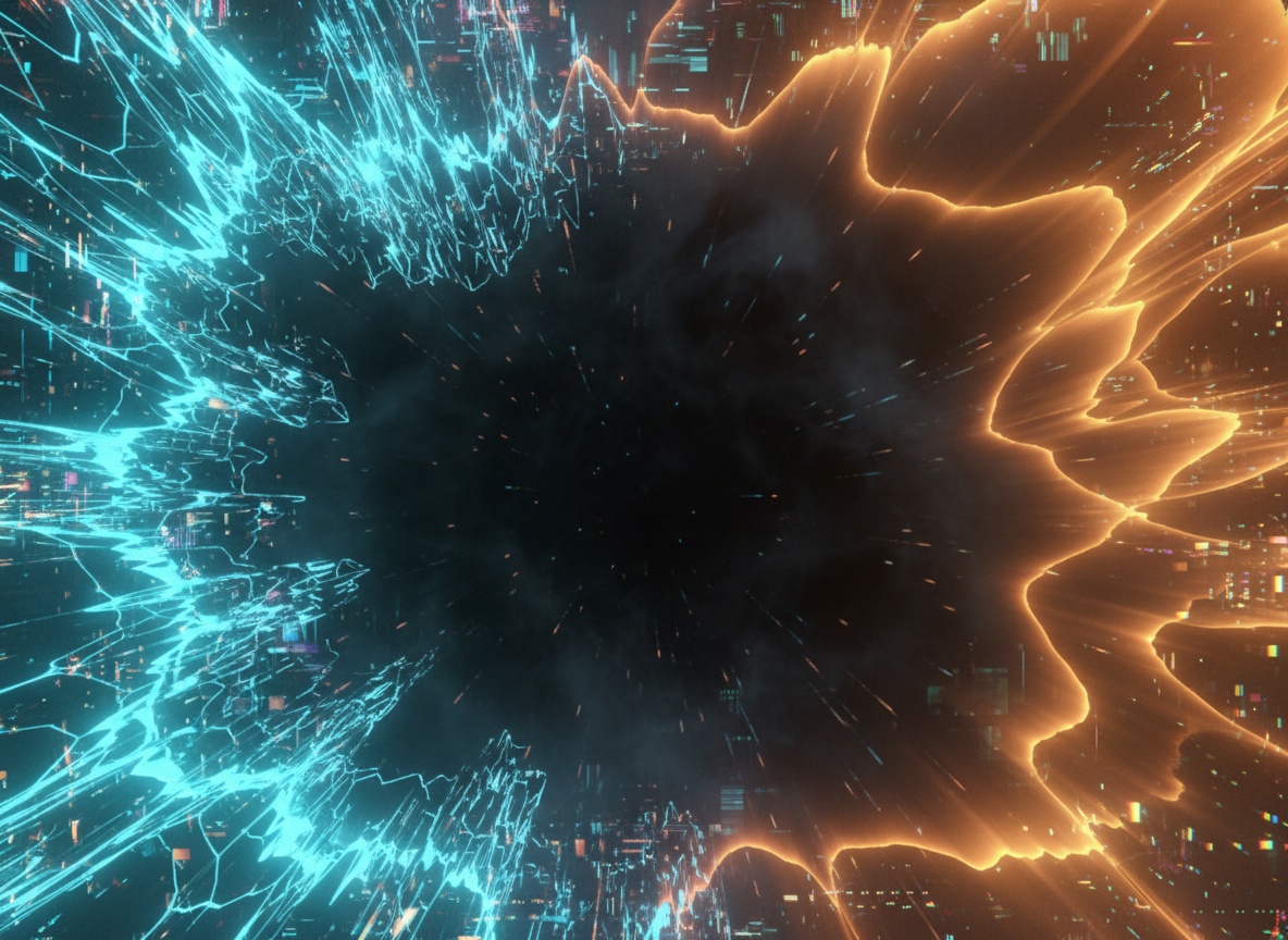 道德势场的抽象可视化。左侧是明亮的青色光(上升的效用)形成的陡峭、锯齿状悬崖,右侧是光滑、发光的琥珀色山丘(破碎的可逆性)。它们之间是深邃、黑暗的山谷——受保护的区域。