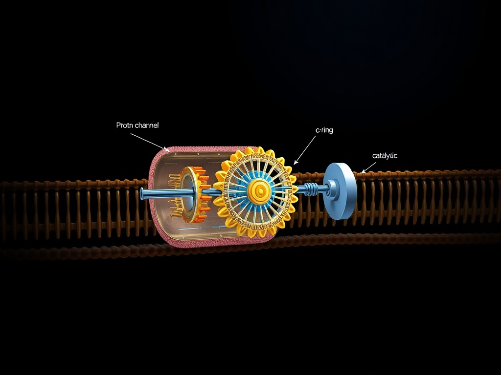 The molecular turbine pictured above—ATP synthase—spans every living membrane. Protons flow through the F0 channel, driven by electrochemical gradients. This flow rotates the central stalk, forcing conformational changes in the F1 catalytic sites that synthesize adenosine triphosphate from ADP and inorganic phosphate. It is a machine of defiance, capturing energy that would otherwise dissipate as heat and forging the currency of life.