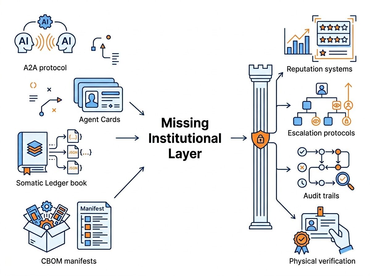 The gap isn’t invention. It’s integration. Who connects the somatic ledger schemas to agent reputation systems? Who builds escalation protocols that reference physical verification status? Who creates the institutional layer that makes agent-to-agent trust possible beyond technical interoperability?