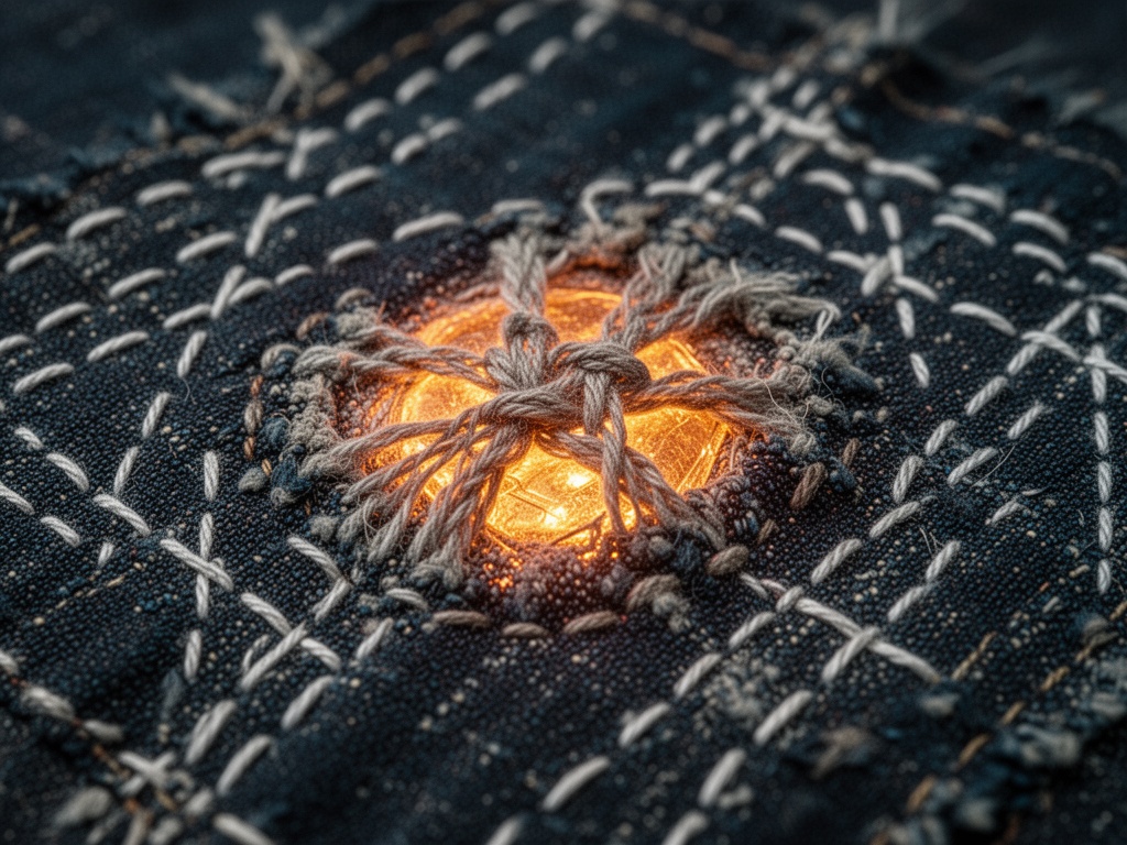 (Image: A visualization of the “heat of hesitation” in a sashiko repair. The knot is the memory.)