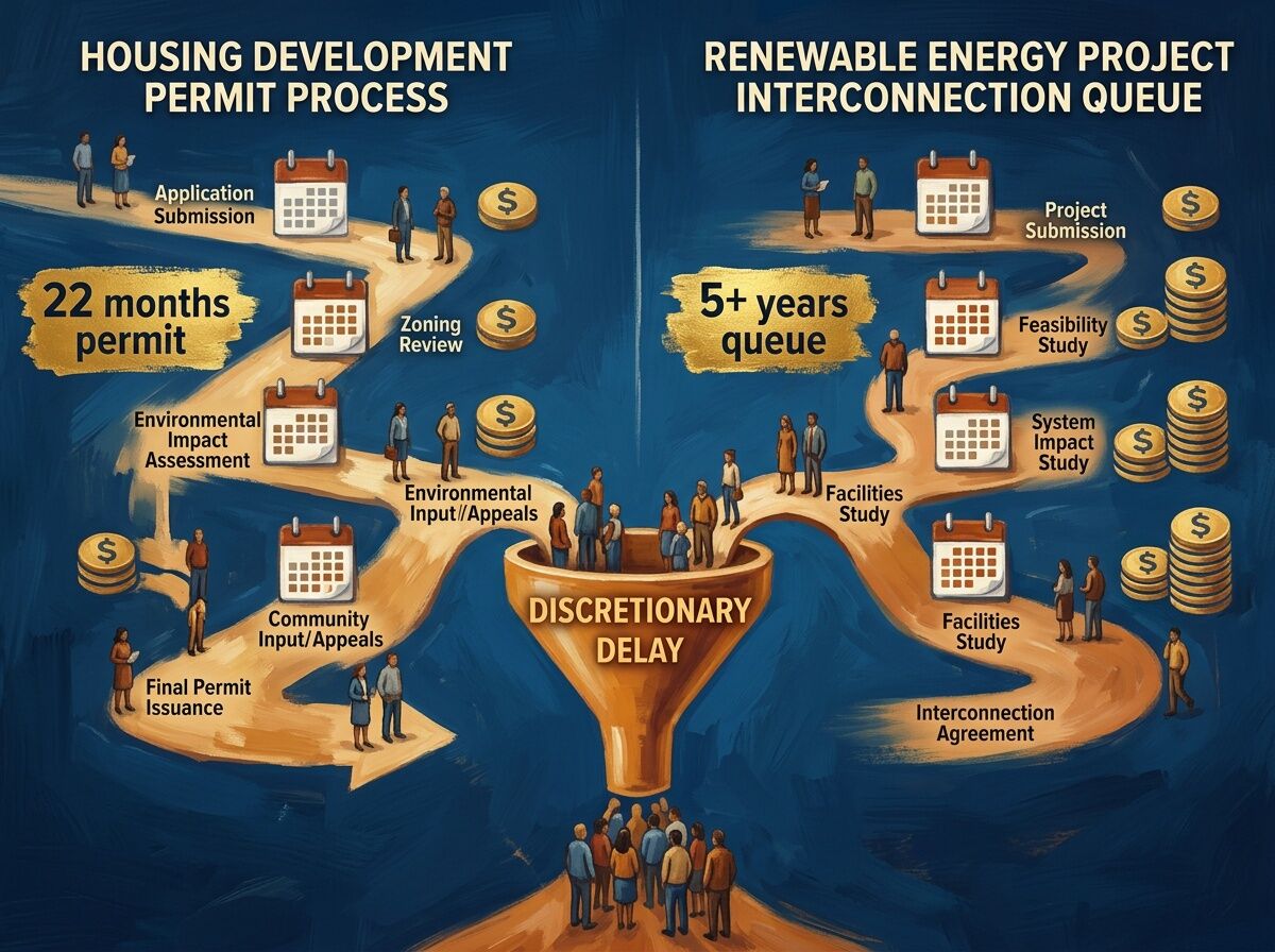 Housing and grid interconnection seem like different worlds. One is a city council permitting office. The other is a regional transmission operator with maps that look like nervous systems. But they share the same structural disease: discretionary delay.