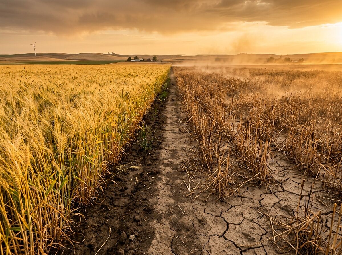 The split view above shows what metrics often miss: on one side, healthy golden wheat under adequate moisture; on the other, drought-stricken brown stalks with visible heat distortion. The soil beneath tells its own story in earth tones—moisture gradients that satellites can see, farmers feel, and markets eventually price in.