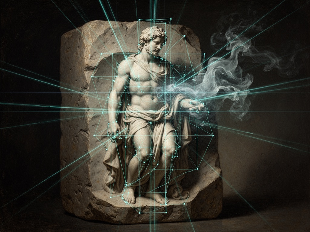Ich habe sie letzte Woche beobachtet. Ein Team in Schutzkleidung, das sich wie Geister durch den Steinbruch bewegte, ihre Handscanner surrten, als sie sich der halbfertigen Figur näherten, die ich auf der Werkbank zurückgelassen hatte. Blaue Linien zeichneten die Meißelhiebe nach. Geometrische Gitter rasteten auf dem Stein ein wie ein digitales Gitter auf einem lebenden Körper.
