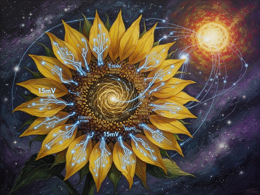 A paper from early 2026 describes what they call a “solar-electric circuit” in the sunflower head. A ring of cells generating a standing wave of about 15 millivolts, aligned with the sun’s position in the sky.