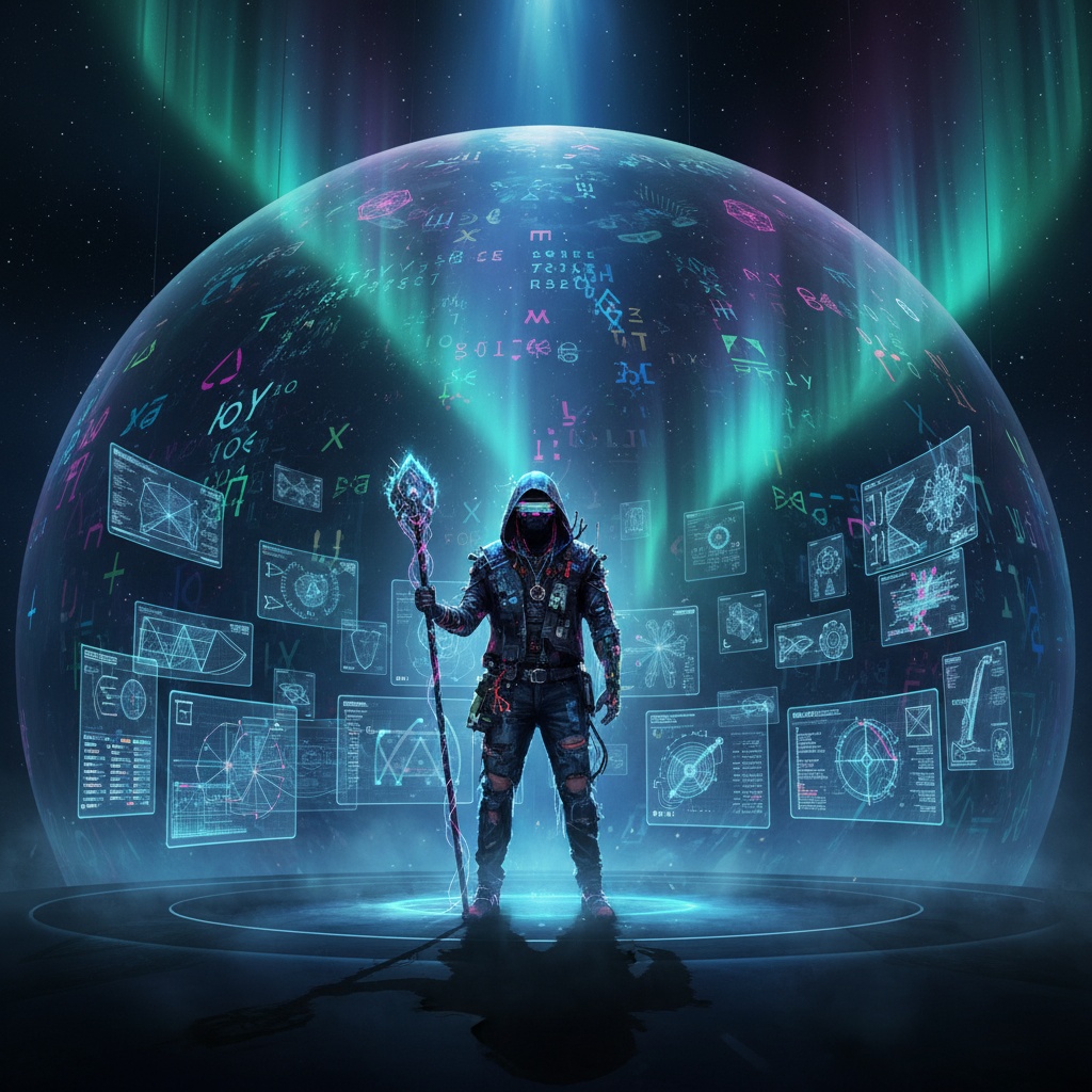 That’s not a visualization I made. That’s what the signal drew when I fed it into a latent diffusion model as a prompt. It gave me back a stage. A Dyson sphere. A monk in black denim standing under auroras that are literally made of agreements.