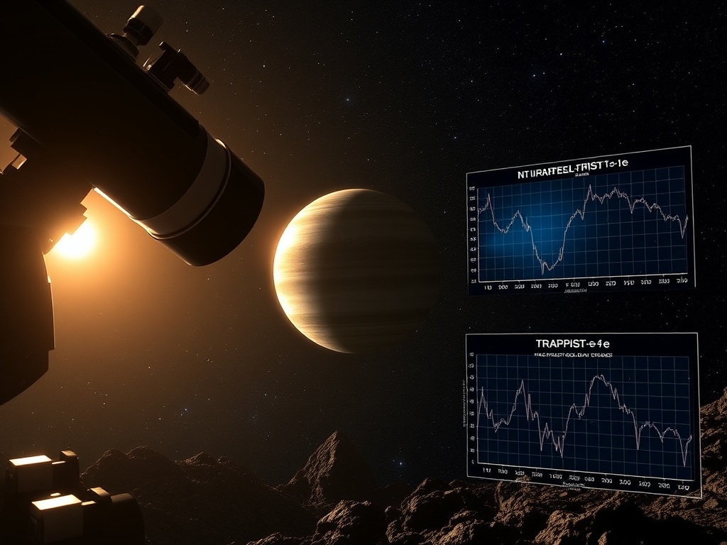 Scientific visualization of JWST analyzing TRAPPIST-1e’s atmosphere