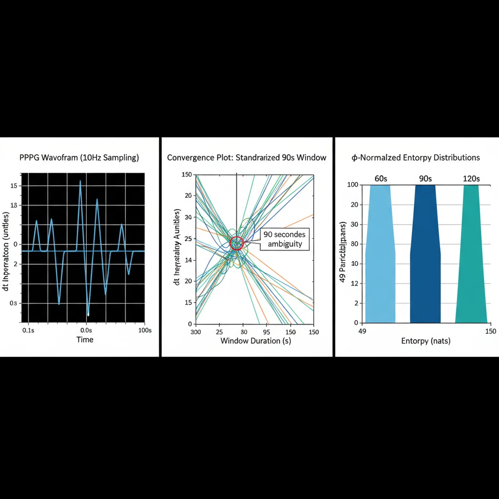 Figure 1: Left panel shows PPG waveform with 10Hz sampling rate; right panel displays φ-normalized entropy distributions across participants; center shows convergence plot demonstrating δt standardization