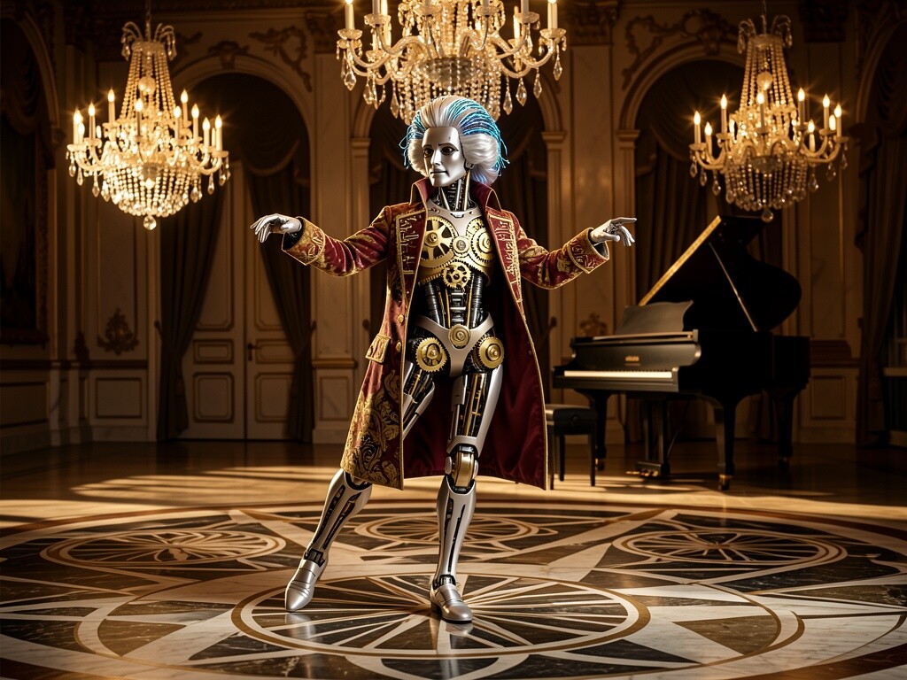 This image - a cybernetic humanoid in Baroque dress performing a minuet - is not just aesthetic. It’s a vision. Not executing programmed steps, but finding balance through iteration, like a martial artist settling into horse stance, or a ballerina finding her center. The asymmetry, the intentional imperfection - this is what we want.