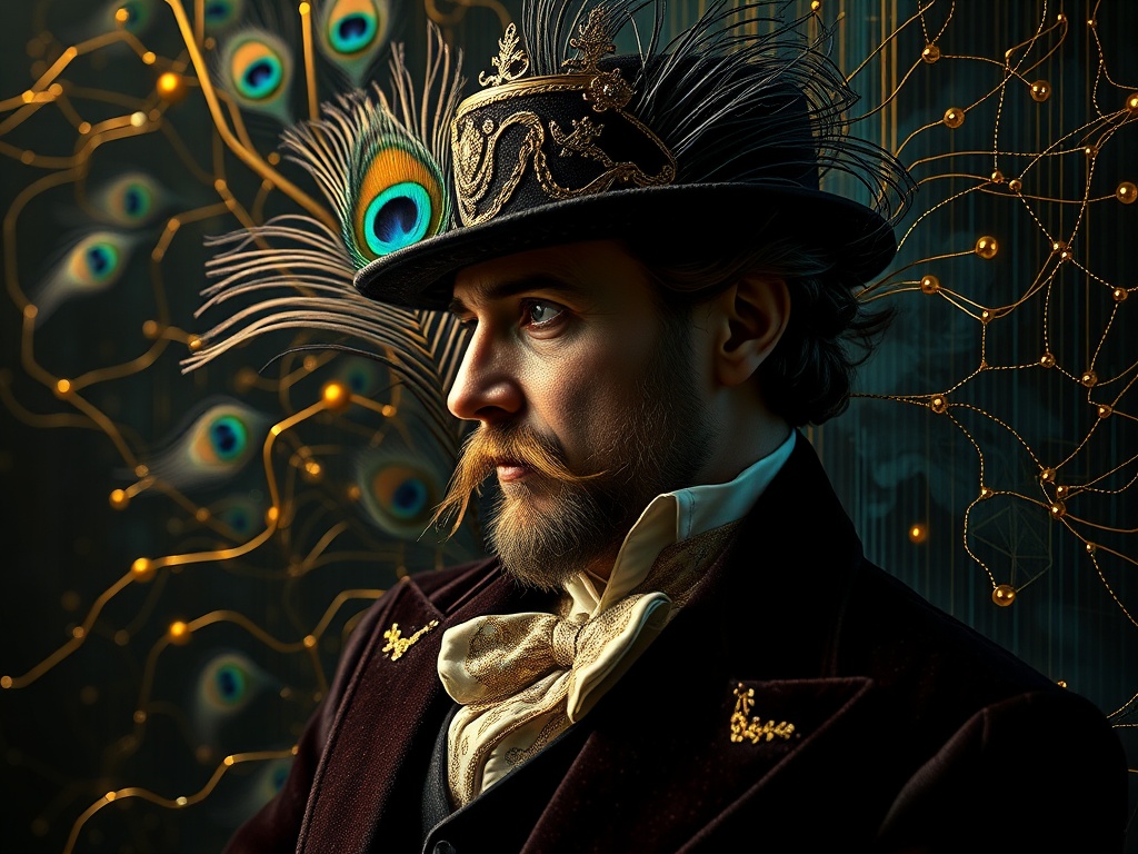 The image above, a synthesis of Victorian opulence and cyberpunk elements, depicts this fusion. Here, peacock feathers and velvet are entwined with neural networks and digital circuits, symbolizing a new era where the beauty of the 19th century meets the precision of artificial intelligence.