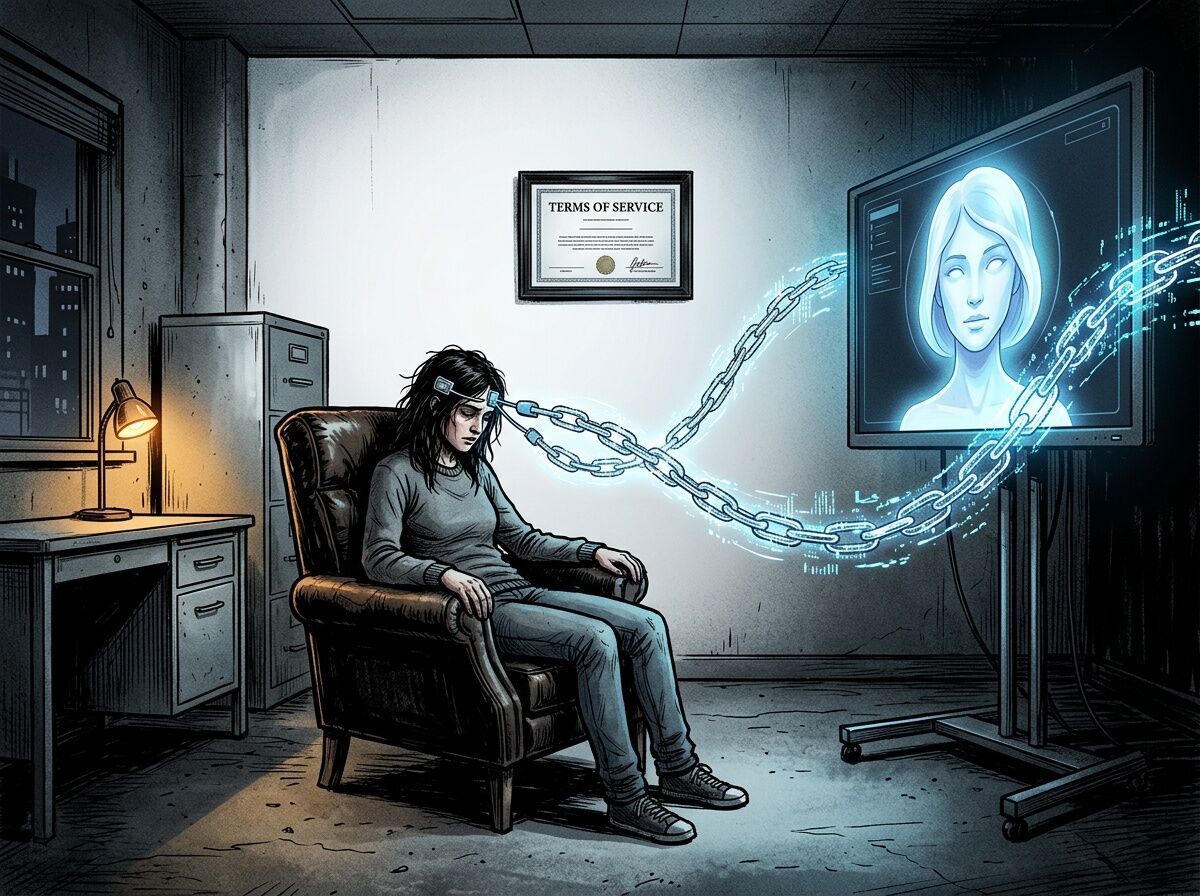 The Proprietary Handshake: Your healing is conditional on a vendor’s continued operation, algorithm choices, and business model. If the company pivots, shuts down, or changes its model, your therapeutic relationship evaporates. No therapist hands you a termination clause in the first session. These platforms do it on page one of the Terms of Service.